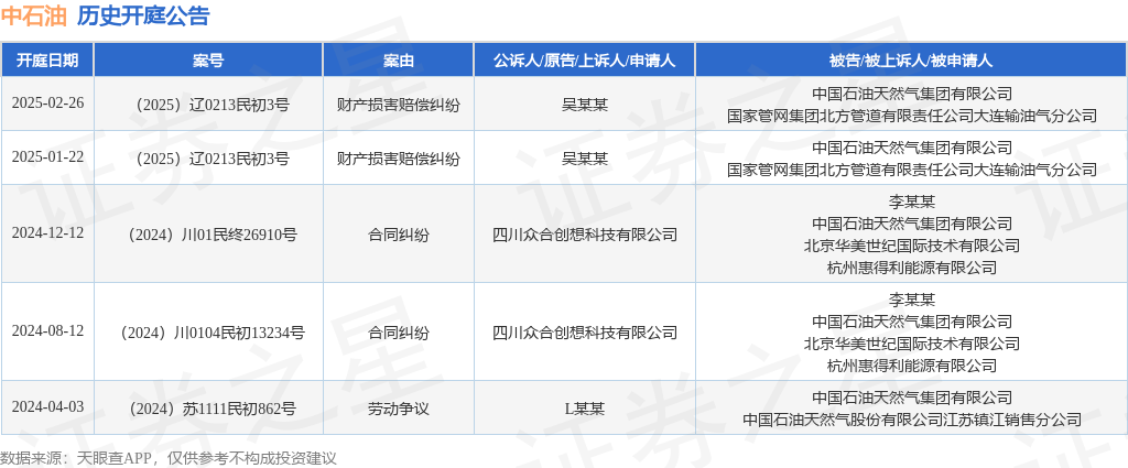 本站消息,根据天眼查APP显示,近日公布了一则中国石油天然气集团有限公司作为被告/被上诉人的开庭公告,详细内容如下: